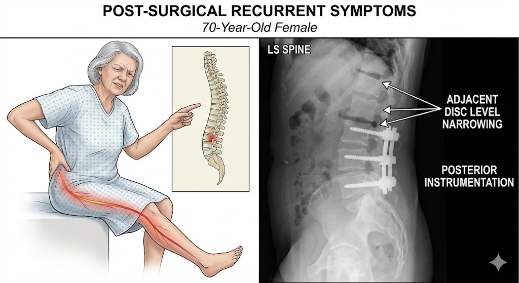 เอกซเรย์พบว่าเหล็กชุดเดิมยังอยู่ดี ไม่หัก ไม่หลวม แต่ข้อกระดูก เหนือ เหล็กที่ดามไว้ มีความเสื่อมรุนแรง ช่องว่างระหว่างกระดูกแคบลง และ MRI ยืนยันว่ามีหินปูนและหมอนรองกระดูกที่ข้อระดับ L2-L3 (เหนือจุดที่ผ่าเดิม) ไปกดทับเส้นประสาทข้างขวา
